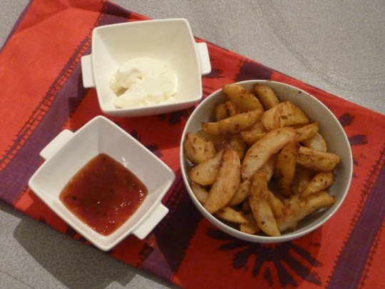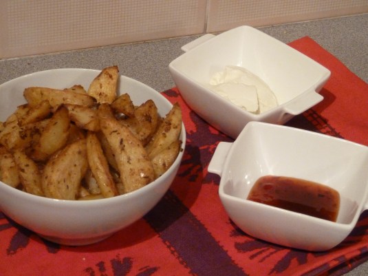 I often avoid buying sour cream as rarely does the recipe call for enough to warrant purchasing a 250g tub. I have searched high and low for anything smaller than that, but to no avail. If only you order it to the gram in the deli section. If it is, someone please tell me! You see our household just doesn’t seem to eat certain creamy substances that often. A block of cheddar? Gone in a week. Yoghurt? One of the items that sends me running to the shops at random hours. But ricotta? Philly cheese? Crème Fraiche? Sour cream? Not so much. I honestly cannot fathom why, but that’s just how it is. So when my dad dashed out for a tub on Monday night, not trusting the spice factor in my sweet potato enchiladas, it put me in a bit of a pickle. What to do with the inevitable left-overs, apart from bake with it? In the end it was my sister who forced made the decision. “Wedges!!” She exclaimed with a fierce glint in her eyes and a stabbing motion of her fork. So wedges it was.