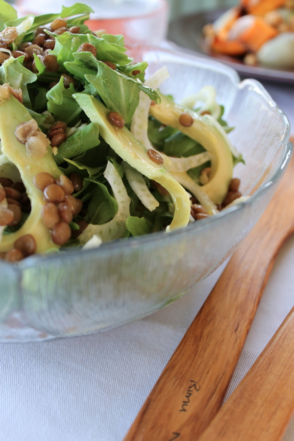 Do make the effort to whip up your own dressing. Not only does it contain far less sugar than store-bought types, but also has a far superior taste – zingy rather than cloying. It enhances the pepperiness of the rocket and aniseed tones of the fennel, rather than masking them. I made a relatively small batch of dressing as I prefer to predominantly marinate the lentils in lemon juice alone, however that isn’t to everyone’s taste. The recipe can easily be doubled and there is certainly no harm in having some left over – it will keep for a week or two in an airtight jar in the fridge.
