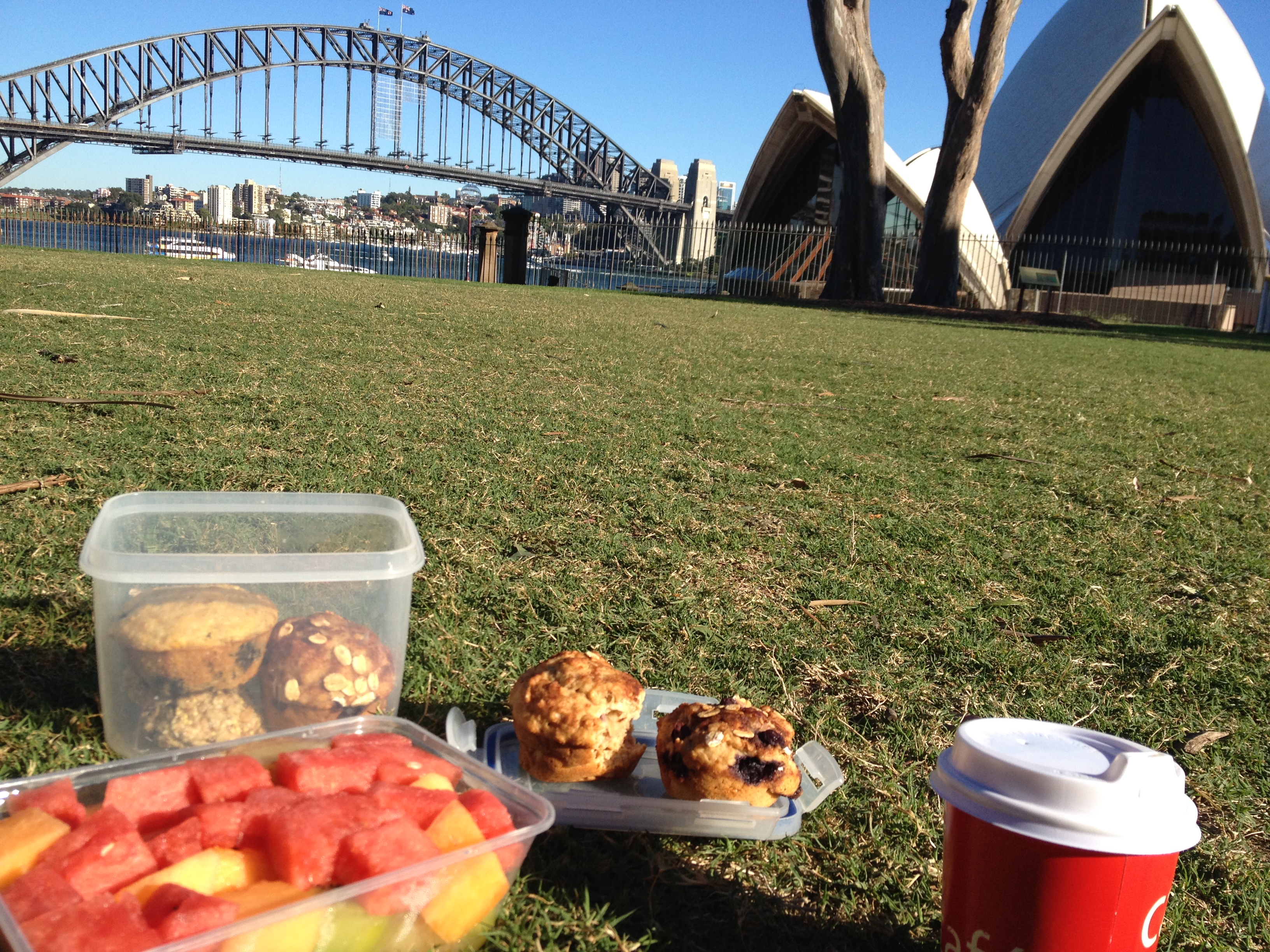 To celebrate our final week in Sydney early one morning my sister and I headed down to Circular Quay. We had a beautiful breakfast perched on a rolling lawn in the botanic gardens, overlooking the Sydney Harbour Bridge and Opera House. And we weren’t plagued with guilt regarding how much we’d spent on breakfast. If you find yourself a tad peckish down at Circular Quay you’re looking at around $7 for a muffin. A muffin. After finding ourselves trapped in this situation more times that I’d like to admit, we opted to bake our own muffins the day before and pack them along with a freshly cut fruit salad. I can assure you the breakfast was significantly healthier and tastier – not to mention cheaper – than one we would have purchased.