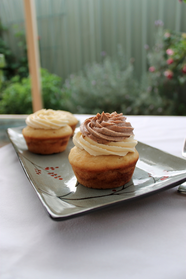 Pipe/spread the cooled cupcakes with the mocha buttercream and top with the vanilla.