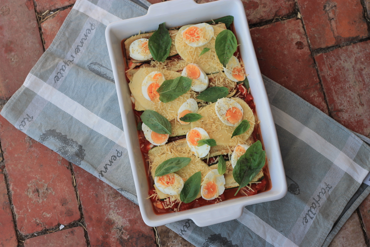 Assembly: Ladle 1/3 of the tomato sauce into the prepared baking dish and spread to cover the base. Then cover with a layer of zucchini slices (use 1/3), then ½ of the mozzarella slices, followed by ½ of the boiled egg, 1/3 of the parmesan and half of each of the basil and mint leaves. Sprinkle with freshly ground black pepper and repeat the layering process. Finish with the final 1/3 of courgette, then the final 1/3 of tomato sauce and finally the last of your parmesan.
