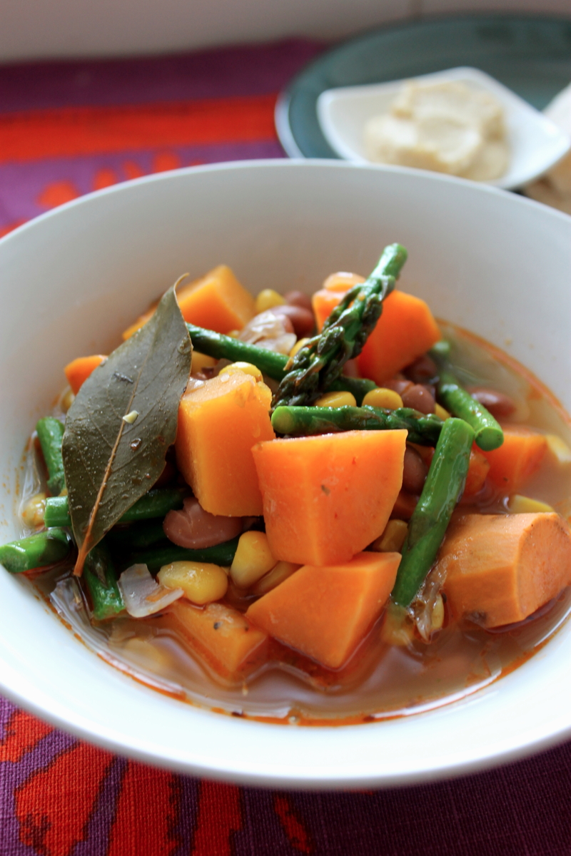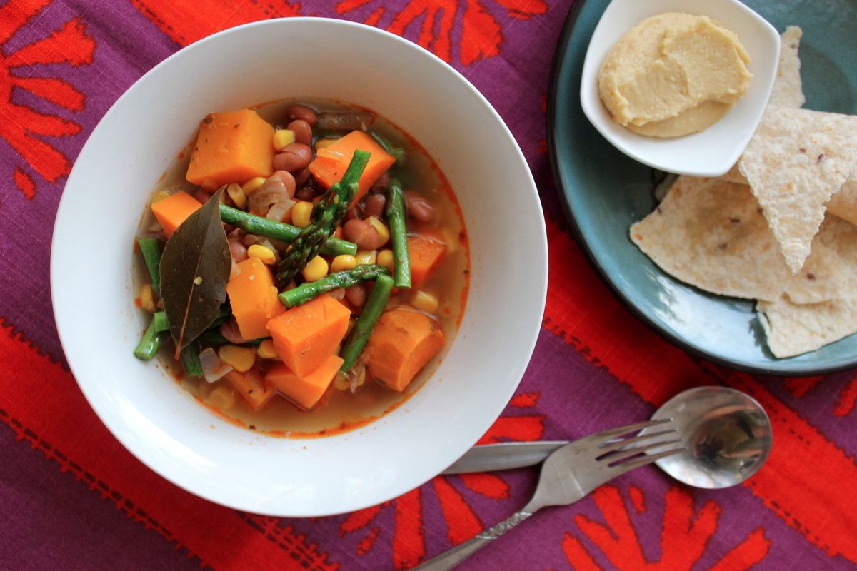 Porotos Granados. Is it a soup? Is it a stew? No-one will ever know. This version of the Spanish dish is confused but happy. Like me a lot of the time. I guess you could call it a chunky soup. Not that it particularly matters. Why do we always feel as though we have to define everything? What if you don’t want to be the ‘girl next door’ or the ‘crazy bitch’ or the ‘cute geek’? This dish could be feeling the exact same thing. It doesn’t want to be pinned down by labels, nuh-uh! It’s its own individual self. Quirks and all. It’s sweet from the butternut squash and corn, slightly spicy from the smoked paprika, creamy from the sweet potato and borlotti beans and just damn delectable with the addition of oregano and caraway seeds. And Asparagus is in season, big yay! Sure, you’re always going to face the conundrum of whether to eat it with a spoon or a fork, but if that’s the biggest issue you face for the day I think you can handle it. Why, try both! No, not one in each hand…ah you know what I mean.