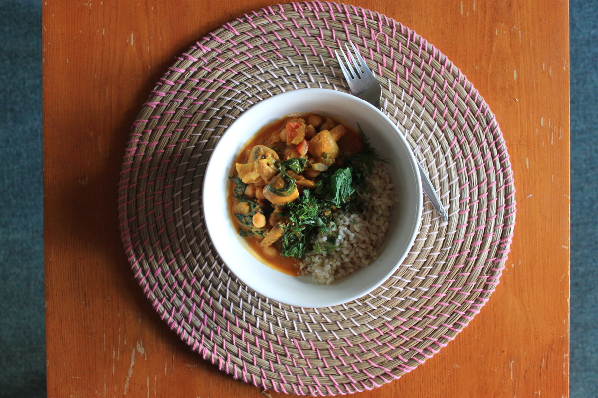 You know you should have perspective and someone quite sweetly reminded you of that last night. But it’s hard. Damn hard. When the five-year old tantrum thrower emerges, it’s hard to squash her. Okay but try. Come on. Think of something. Ah. That’s right. What about the curry you had for dinner? The Chickpea and Mushroom one? It was yummy wasn’t it? You remember enjoying that. Eating it while sitting on the couch, happily watching the contents of your old Mac transfer to the new (oh only if you knew what would eventuate, wait don’t get off track, happy thoughts, happy thoughts). Remember how it tasted even better reheated than when you first made it two nights ago? It’s one of those gems. And with that brown rice? Good. So good. You were happy! And, there’s another serve in the freezer. Something to be excited about! Oh and it’s so easy to make – it’s going to be your new go-to busy-gal curry.